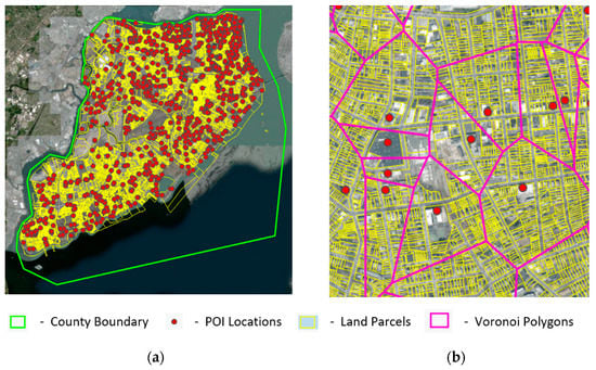 (a) Land parcels and POI locations within the Richmond County (Staten Island) overlaid on imagery basemap [] (b) Voronoi polygons and their associated POIs within a section of Richmond County.