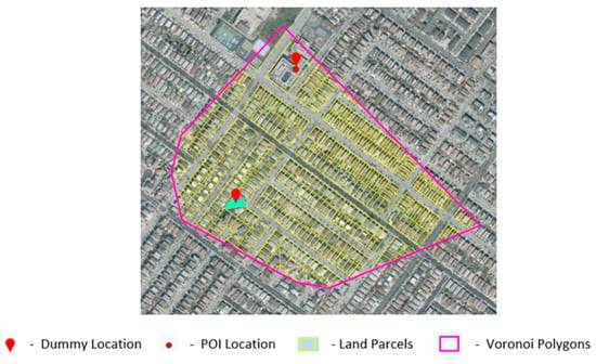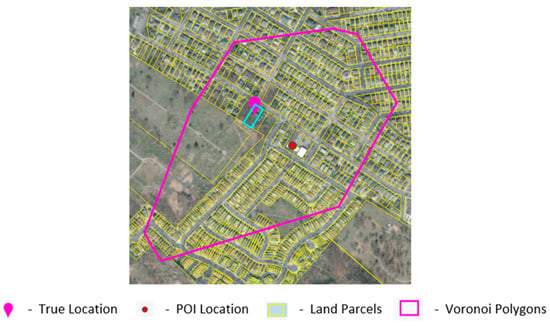 We propose a point of interest (POI)-based approach to producing semantically balanced dummy locations. A physical location associated with a POI is employed for delineating the influence of the POI within a geographical space through Voronoi polygons. Within each Voronoi POI influence area, the parcel-based dummy generation framework devised by Tadakaluru [] is then deployed to create dummy locations that are spatially similar to legitimate ones. These topics are further articulated in detail in Section 3.1, Section 3.2, Section 3.3 and Section 3.4.