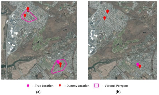 For a location set with four locations (k = 4): (a) shows the true location and three dummy locations with their respective Voronoi polygons and (b) shows the true and dummy locations only.