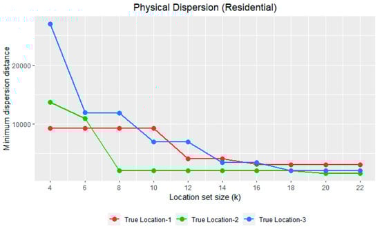 Plots show physical dispersion of residential locations in a location set with the size of location set (k) on X-axis and minimum dispersion distance (meters) on the Y-axis.
