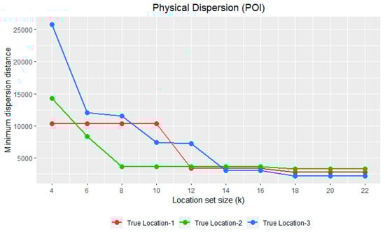 Plots show physical dispersion of POI locations within a location set with the size of location set (k) on X-axis and minimum dispersion distance (meters) on the Y-axis.