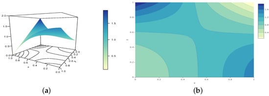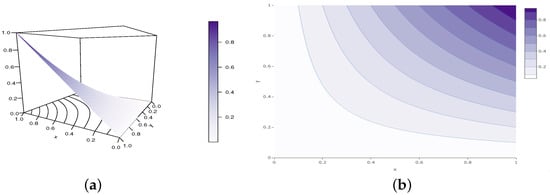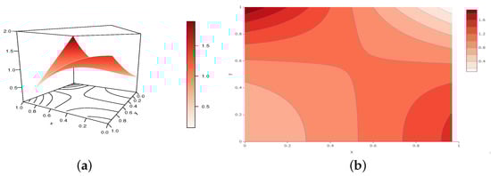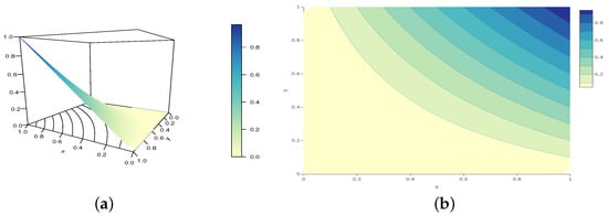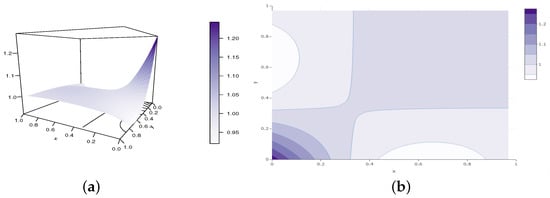 Illustrations of the (a) perspective plot and (b) contour plot of the GCC copula for the following configuration: and , belonging to Configuration 1.