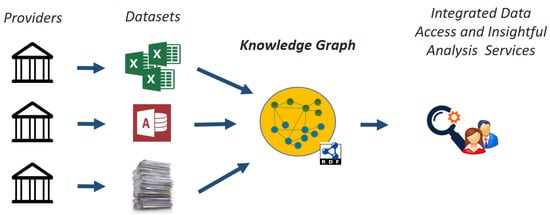 To leverage large scale data for gaining new insights, a recent and promising practice in various domains (environment, health, economy, culture, economics and others), adopted by both academia and industry, is to construct a Knowledge Graph (KG) [] that aggregates and integrates data from several datasets, as illustrated in Figure 1. The value of such KGs is that they provide a unified view of the domain and enable unified browsing, querying, question answering and analytics. Indeed, there are several KGs expressed in the W3C standard RDF (Resource Description Framework), including general purpose KGs, like DBpedia [] and Wikidata [], domain-specific KGs [], like Europeana [] for culture, DrugBank [] for drugs, GRSF [] for stocks and fisheries, ORKG [] and OpenAIRE [] for scholarly work, WarSampo [] and SeaLiT [] for historical research, recently also for research related to COVID-19 such as [], COVID-19 Open Research Dataset (https://github.com/allenai/cord19, accessed on 1 January 2023) and CORD-19 Named Entities Knowledge Graph (https://zenodo.org/record/3827449, accessed on 1 January 2023), and finally KGs from enterprise relational databases [].
