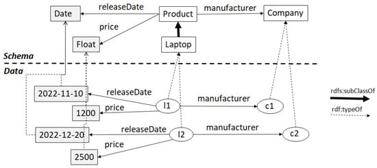 RDF Schema. RDF Schema (https://en.wikipedia.org/wiki/RDF_Schema, accessed on 1 January 2023) (RDFS) is a special vocabulary that comprises a set of classes with certain properties based on the RDF extensible knowledge representation data model. Its intention is to structure RDF resources, since even though RDF uses URIs to uniquely identify resources, it lacks semantic expressiveness. It uses classes to indicate where a resource belongs, as well as properties to build relationships between entities in a class and to model constraints. For example, a KG with information about products is shown in Figure 2 (for reasons of brevity namespaces are not shown). The upper part illustrates the schema, while the bottom part illustrates the data.