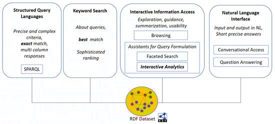 Apart from structured query languages (i.e., SPARQL), we have Keyword Search systems over RDF (like []) that enable users to search using the familiar method they use for Web searching. We can also identify the category Interactive Information Access that refers to access methods beyond the simple “query-and-response” interaction, i.e., methods that offer more interaction options to the user. In this category, there are methods for RDF Browsing (plain or similarity-based like []) methods for Faceted Search over RDF [], as well as methods for Assistive (SPARQL) Query Building (e.g., []). Finally, in the category natural language interfaces, there are methods for question answering, dialogue systems, and conversational interfaces (e.g., see [] for a survey). Figure 4 illustrates the above methods and the distinctive characteristics of each one.