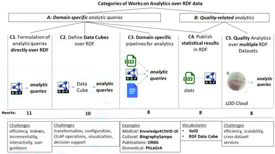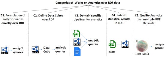 RDF data are mainly queried through structured query languages, i.e., SPARQL (https://www.w3.org/TR/rdf-sparql-query/, accessed on 1 January 2023), which is the standard query language for RDF data. From version 1.1, SPARQL also supports complex querying using regular path expressions, grouping, aggregation, etc. In particular, and as regards analytic queries, SPARQL supports the modifier GROUP BY and supports various aggregate functions including COUNT, SUM, AVG, MIN, MAX, and GROUP_CONCAT.