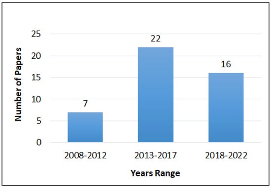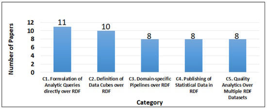 For finding the related approaches, we used Google Scholar in the period of June 2022–November 2022 without any restrictions on the publication date. We used the following queries: (i)“RDF analytics tool”, (ii) “Interactive RDF analytics”, (iii) “RDF Data cube analytics”, (iv) “Efficiency of RDF data analytics”, (v) “Knowledge graph analytics” and (vi) “LOD Cloud analytics”. For each query, we analyzed manually papers (from the first pages of Google Scholar results), i.e, by checking their title, abstract and body. Moreover, we found relevant papers from past surveys, e.g., for analytics over multiple datasets belonging to the LOD Cloud []. Concerning the selected papers, Figure 6 shows some statistics about the number of surveyed papers for each category and Figure 7, the year of publication of these papers. As we can see, the majority of works that we survey concern the categories C1 and C2, and most of the papers have been published between 2013–2017 (i.e., the most common case for the two mentioned categories). On the contrary, we also survey some more recent approaches (i.e., between 2018–2022), that mainly concern domain-specific pipelines (i.e., category C3) and approaches over multiple datasets at LOD scale (i.e., category C5).