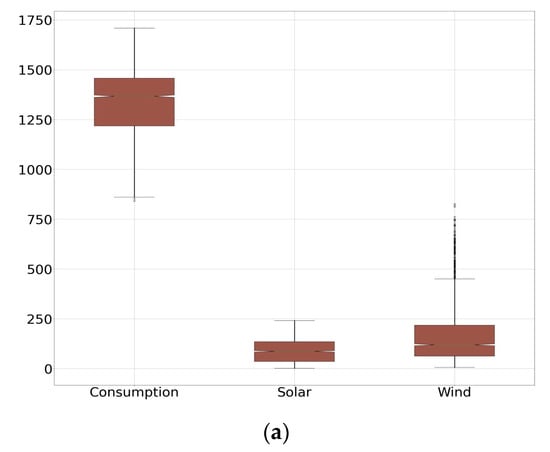 Equation (1) shows the standardization formula for the renewable energy production series. The difference between the renewable energy production value and the minimum of the entire renewable energy production series was divided by the range of the series, providing the standardized data, which were further used in the training/testing process of the RNN, indicated as activity 4 in Figure 1. The entire standardized renewable energy production series was split into two portions, i.e., a training set that was used to train the model and a testing set that was used to test/evaluate the model. Seventy percent of the dataset was used for training, and thirty percent was used for testing. In a nutshell, EDA and feature engineering were pivotal steps for the satisfactory performance of the predictive model.