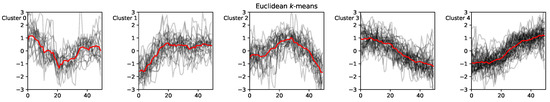 The high-level agent is endowed with a classification mechanism , which clusters incoming series into different classes and feeds different agents with samples from these different clusters. This mechanism is analogous to the subgoal discovery problem [34,35], where similar processing exists where the high-level agents find attractive states for the low-level agents to reach. Because the environment is different in our c, reaching the subgoal does not have any real meaning. We use k-means [36] from the Python library (https://github.com/tslearn-team/tslearn/, accessed on 19 January 2023) for clustering the time series, with an episode length of 50 and 5 clusters. We tested more clustering algorithms, but they all gave similar results, so we chose the simplest one. We also tested more values for the number of clusters, but we chose a small one that showed the significant trends that one can see in a market.