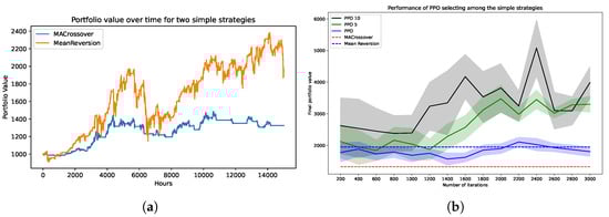 Performance of a hierarchical agent (PPO) using two basic strategies as low-level agents. (a) Mean reversion and moving average crossover strategies. (b) PPO selecting between the two strategies.