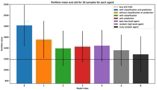 We sample data at 1 h frequencies and use 4000 data points for training the low level, 8500 points for training the high level (including the previous 4000), and 10,000 points for testing (BTCUSDT taken from Binance (www.binance.com, accessed on 19 January 2023), 2019-10-23 07:00:00–2022-01-30 21:00:00). For details on the data splits, see Figure A2. For training the low level, we sample episodes at a length of 50. For the high level, we use 1500 (which amounts to 50 decision points for the high-level agent since it acts every 30 steps). For each performance measurement, we take 30 random samples.