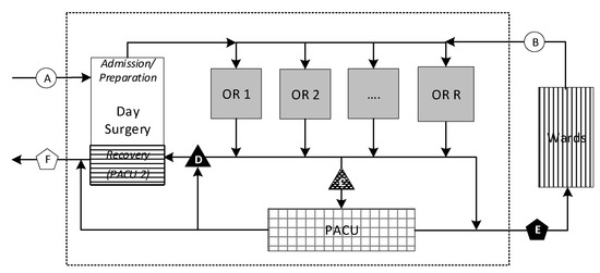 Figure 1 provides a global view of the perioperative system through which three basic categories of patients flow: one-day stay (ODS), same-day admission (SDA), and in-patients (IPs). At the highest level, ODS and SDA patients enter the system from outside the hospital through admission and preparation (A), whereas IP patients arrive from a hospital ward (B). As for departures, ODS patients leave through Day Surgery from whence they arrived (C and F), whereas SDA patients are transferred into a hospital ward (E), through which IP patients also return to their ward, although either may be transferred instead to an intensive care unit (ICU) bed.