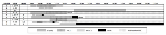 Figure 2 shows several examples of patient flow. The characters in the ‘Flow’ and ‘Delay’ columns correspond to critical points in the process as depicted in Figure 1, that is, the path through which each example patient flowed and the location(s) at which they encountered any delays. The patterns within the timelines correspond to the various locations in Figure 1. We are concerned with delays both upstream and downstream from the PACU, as eliminating the latter can effectively eliminate at least some of the former. The downstream delays are represented in solid black, corresponding to the same format as points ‘D’ and ‘E’ in Figure 1, and these are delays in moving patients from the PACU to either PACU2 or to a ward bed. Checkered black intervals represent upstream delays moving patients into the PACU (at point ‘C’ of Figure 1) coming from any one of the ORs. Brief gaps between intervals correspond to the patient transit times and thereby separated time-stamp gaps in the hospital data.
