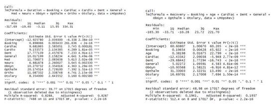 Linear regression models for procedure and recovery durations.