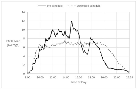Figure 4 depicts the results of the iterative-CP-model-optimized solution in terms of expected patient loads in the PACU. It shows the average PACU patient loads by minute of the day across all sample days, expected if following the day’s pre-schedule versus expected if following the CP-optimized schedules on each day.