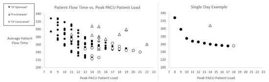 We see in Figure 5 that a load equal to the pre-schedule expectation (14 in this example) is achieved with little increase in the average patient flow time (only 10 min higher than for the unconstrained optimized solution.) Furthermore, a one-third reduction in peak PACU patient load is apparently achievable with a resulting average patient flow time that is equal to that expected with the pre-schedule. A much greater (~45%) reduction in PACU peak load appears to be achievable with only a modest increase in patient flow time. The left side of Figure 5 shows a similar trend over our sample of testing days.