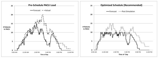 We conducted an ex post analysis using actual procedure and recovery durations in both the pre- and CP-optimized schedules. Figure 6 below shows two paired charts of PACU loads for a typical surgery day. The left side refers to the pre-schedule, and the right side refers to the CP-optimized schedule. On both charts, a solid line depicts the expected count of PACU patients as predicted by our model. The dashed line on the left depicts actual events (considering only scheduled patients) in the PACU that day. The dashed line on the right is slightly different, as we can only simulate what would have happened if the CP-optimized schedule had been adopted—using actual durations for both procedure and recovery, but with different timing.