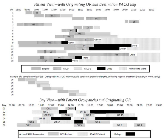 The aim of the patient flow visualization is to provide a systematic view of the process in spite of the uniqueness of a great many cases across many ORs. Effective management requires a clear understanding of both ‘the forest and the trees’, and appropriate aggregated levels between these extremes. The top of Figure 7 shows timelines for 16 patients passing through the first six PACU bays, shown at the bottom. They represent roughly a quarter of scheduled procedures on a sample day. Through cross-referencing the two views, it is straightforward to trace delays in the PACU to a patient’s destination ward (or PACU2) and to match OR delays with concurrent activity in the PACU.