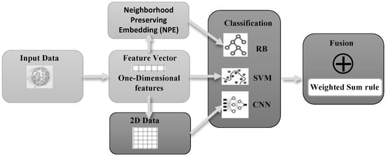 Structure of the proposed approach: The input data is represented through a 1D vector that is used to train the SVMs. The same is also transformed with NPE to train RB. Specific transformations are applied to the 1D input in order to transform it into a 2D matrix to train the CNNs.