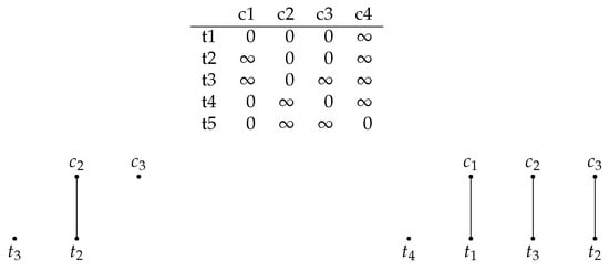 We close this section with a simple example illustrating both Algorithm 1 and its implementation in the R environment []. Consider the cost matrix in Figure 2. The matching problem requires five treated units to be matched with four control units, and thus a complete matching is not possible. The order-optimal element is , and it is found after using the backward correction algorithm twice. Two order-optimal matchings can be built on the order-optimal element, as shown in Figure 3.