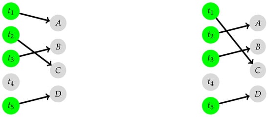 It turns out that the family of matchable subsets of T has a special structure, being a matroid. Informally, this means that (1) any subset of a matchable subset is itself matchable, and (2) matchable subsets enjoy an extension property: it is always possible to extend a matchable subset using an element from a larger matchable subset. A proof of this can be found in the work of Cook et al. (1998) []. Below is an adapted proof using our nomenclature.