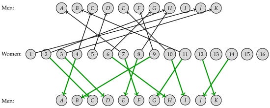 The previous definition excludes the occurrence of incomparable subsets which cannot be compared in a straightforward manner (e.g., subsets like and , with the former matching more important units but the latter matching more units). It is not obvious that the order-optimal matching defined above exists for any possible order of T. The latter is a classic combinatorial result as indicated by D. Gale [].