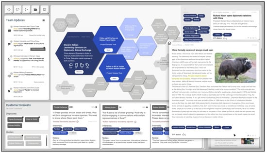 An overview of The Hive interface’s design: The main panel consists of multiple hexagon information modules to help linguistic analysts focus on their current task. Peripheral interfaces surrounding what the analyst is currently working on offer interactive summaries of critical documents, labels associated with the summaries, and on-demand details of the summaries if they wish to clarify information.