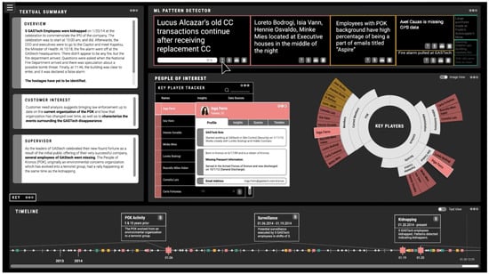 An overview of the Sunburst interface’s design: The main panel consists of sections relevant to situational awareness. That includes a textual summary of relevant information and a timeline of events for knowledge workers and people of interest that includes an exploded view to assess patterns. A screenshot of the high-fidelity design interface in Case Study 2; details are provided in the caption.