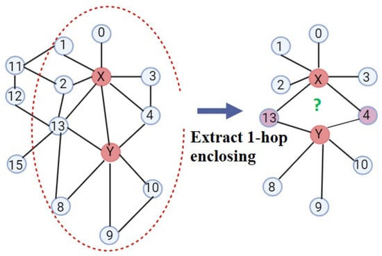The SEAL framework [24] demonstrates that all the information obtained from global link prediction approaches, such as Katz index [25] and PageRank [26], can be derived through local enclosing subgraphs. Therefore, for each positive (existing) and negative (non-existing) connection, we extract a 1-hop local enclosing subgraph. As you can see in Figure 3, the enclosing subgraph for a pair of nodes refers to the subgraph formed by considering the neighbors of both x and y up to a specified number of hops, denoted as h. This subgraph is obtained by taking the union of the neighbors within the specified hop distance.