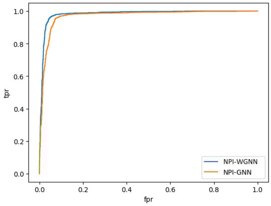 Furthermore, as part of our study, we plotted precision–recall curves and ROC curves to further evaluate the effectiveness of the proposed methods with the NPI-GNN on NPInter2.0. As shown in Figure 4, the AUPR of the NPI-GNN and NPI-WGNN methods are 0.960 and 0.977, respectively. According to Figure 5, the AUROC of the NPI-GNN and NPI-WGNN methods are 0.969 and 0.982, respectively.