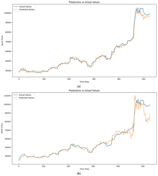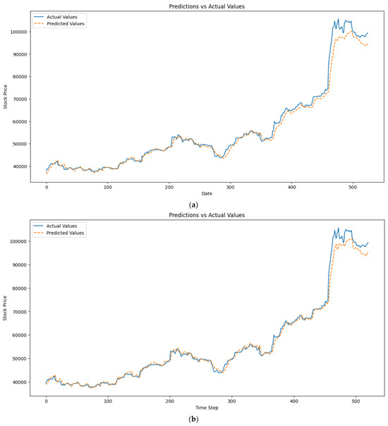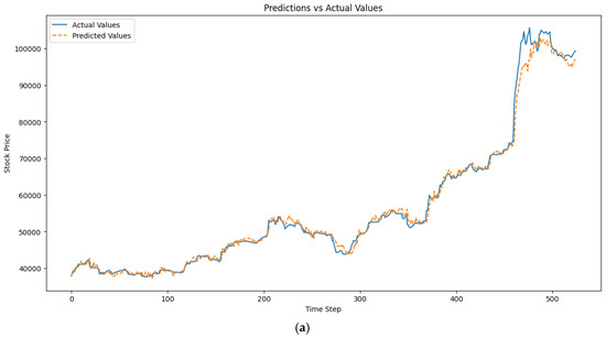 The results in Table 7 show that LSTM can predict accurately even without optimisation of the model or normalisation of the dataset. However, we experimented with the normalised and optimised variants and obtained a better R-squared performance [37,38]. This is due to the sequential nature of the time-series data. The evaluation metrics show improved performance of the LSTM model with increasing time steps and the inclusion of On-Balance Volume (OBV), as confirmed by studies [39,40]. In the classic approach, MAE decreases from 0.015 to 0.012 and MSE decreases from 0.000745 to 0.000485 as time steps increase. Including OBV further lowers MAE to 0.009662, indicating enhanced predictive accuracy. RMSE and MAPE also decrease, with MAPE reducing from 1.96% to 1.61% in the classic approach and to 1.33% with OBV inclusion. The R-squared value increases to 0.993, demonstrating strong alignment between predictions and actual data and confirming the model’s robustness. Longer time steps improve the LSTM model’s ability to capture trends, while OBV enhances accuracy by adding volume-related insights, a key factor in stock price movements [41]. The predicted vs. actual value plot is shown in Figure 3a–d.