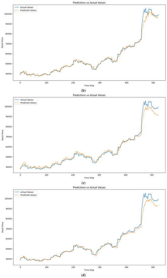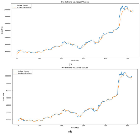 For the optimised model, the prediction was performed using the classic and OBV inclusion approaches. The financial market has several endogenous variables, such as volatility, dividend yield, bid-ask spread, and market sentiment, but the main endogenous variables are price, volume, and returns [30]. Training loss for the classic method increased with longer time steps, highlighting the vanishing gradient problem without optimising the RNN model [31,32,33]. However, adding OBV reduced training loss for the medium to long term, potentially mitigating this limitation. Validation loss decreased in both methods as the time steps increased, demonstrating robust model performance without overfitting. MAE for the classic approach increased slightly, while OBV inclusion showed reduced absolute errors over longer periods, despite starting higher. RMSE increased with more features and time steps, reflecting difficulties in modelling specific data segments. R-squared values remained high, between 0.98 and 0.99, across methods. The predicted and actual value plots for the optimised RNN variations are shown Figure 2a–d.