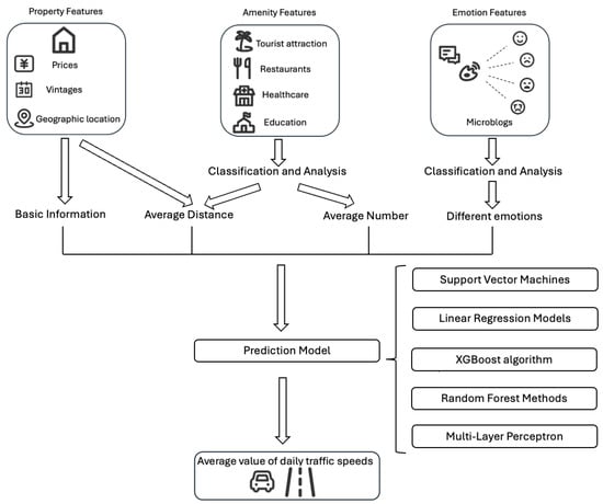 This study aims to delve into the potential of traffic flow prediction through multi-source data fusion, with a particular focus on the combined impact of PAE multimodal data on traffic flow variability. The cornerstone of the study is laid at the data collection and preprocessing stage (elaborated on in Section 3.1), during which a total of 27 feature indicators covering property characteristics, neighborhood amenity status, traffic dynamics information, and socio-emotional tendencies are meticulously extracted. Subsequently, in Section 3.3, we provide a nuanced analysis of the correlation between these features and traffic flows. Further, Section 3.4 provides an in-depth assessment of the specific degree of contribution of different features to the accuracy of traffic flow prediction. In terms of model construction and selection, a series of classically recognized machine learning models were used as validation tools in this study, including Support Vector Machines (SVMs) [47], Linear Regression Models [48], the XGBoost algorithm [49], Random Forest methods [50], and Multi-Layer Perceptron (MLP) [51]. These methods are mature and widely adopted in practice [52]. These models were applied to comprehensively validate the effectiveness of the multi-source data fusion strategy (see Section 3.5 for details). It should be particularly emphasized that the core of this study aims at assessing the application value of multimodal data in the field of traffic flow prediction rather than working on the development of completely new prediction algorithms. We comprehensively integrate multidimensional information such as property attributes, amenities, and socio-emotional information, focusing on the role of these factors when fused to enhance traffic flow modeling. The experimental results (presented in detail in Section 4) show that the multimodal data fusion approach demonstrates significant advantages in terms of prediction accuracy and provides valuable insights into the factors that influence traffic flow.
