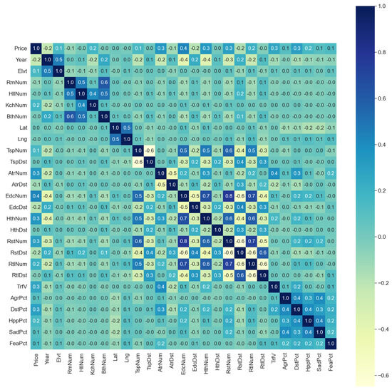 In this study, traffic speed (TrfV) serves as the core dependent variable, which is influenced by multidimensional factors including property attributes, neighborhood amenities, geographic coordinates, and emotional characteristics. To quantify the relationship between these factors and traffic speed, we used Pearson correlation analysis and assessed the reliability of the correlation through significance test (p-value), with p < 0.05 as the threshold to judge statistical significance. The heat map (Figure 2) visualizes the strength of the correlation between the variables and traffic speed and the interaction between different features, which provides a basis for further exploring the indirect effects of the variables and their intrinsic mechanisms. The results and logic of the analyses are explained in detail below in terms of each feature category.