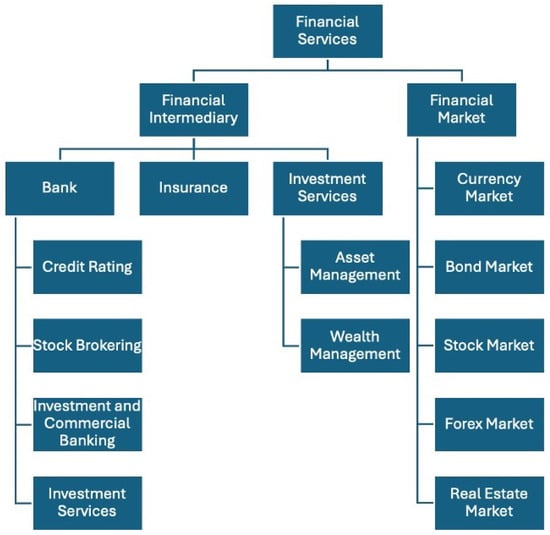 The financial industry has experienced vast innovation spanning the last century, from the introduction of checks, credit cards, automated teller machines, and debit cards, to innovations like internet banking, mobile payments, and crowdfunding driven by fintech advancements []. The landscape in which financial institutions operate has been shifting dramatically due to forces like increased competition, deregulation, and globalization, all of which have played a role in the ascent of fintech and AI []. There are a myriad of key players and systems within finance, which can be broadly separated into financial markets and institutions. Herrman and Masawi define financial services broadly [], encompassing financial advisors, asset management, investment banking, mutual funds, stockbrokering, payment providers, and fintech companies. These services involve a wide range of money-related activities, which generally involve the performance of a service in exchange for a fee. This research focuses on banks and investment services providers in their interaction with financial markets and the impact of AI across all aspects of the organization, as shown in Figure 1.