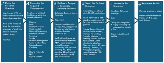 The exclusion criteria were designed to filter out only the articles which are not relevant to the objectives of the research while ensuring that the relevant articles remain within our collection group to be used in the analysis. The heuristics included a set of keywords, and, as the articles were being screened, they were contrasted with the list and were required to reasonably capture the set criteria. The list included the following subjects: finance, banks, financial services, stock markets, financial forecasting, financial advisors, investing, stocks, financial products and services, portfolio management, client intention to adopt AI, client reaction to AI, AI, robo-advising, chatbots, neural networks, natural language programming, expert systems, small/medium/large, and competition.