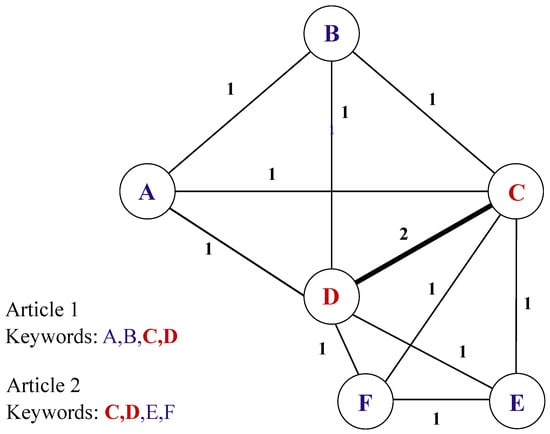 Example of a simple keyword co-occurrence network. Nodes indicate keywords published in articles, and edges represent the co-occurrence of words; the numbers on the edges indicate weights proportional to their frequency.