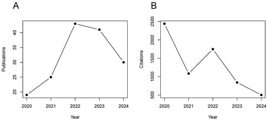 Systematic literature review: (A) exhibits the distribution over time of publications reviewed, and (B) presents citations associated with reviewed articles by publication date.