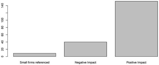 Frequency of articles in the systematic literature review that reference small firms or assess sectoral impacts in the financial domain. The chart categorizes studies based on their mention of small enterprises and whether their findings portray the financial sector as being positively or negatively impacted.
