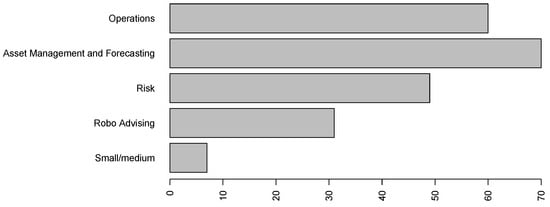 The 160 articles narrowed from the SLR further underwent bibliometric analysis. The number of research reports published annually, according to our sample, significantly increased from 2021 to 2022. The articles were categorized based on five areas of focus in finance, shown in Figure 6. The groupings are small–medium-sized institutions, robo-advising, risk, asset management, and operations. Some articles fell into multiple categories, while others fell within only one group. Asset management yielded the greatest number of articles on that topic. Many of the articles within this category involve asset price forecasting and portfolio optimization. Seventy articles were included in this category. Operations yielded the second-greatest result with 60 articles. Operations broadly encompass AI within the context of the financial business, including implementation and client perception. Risk followed operations with 49 articles and involves credit risk and systematic and unsystematic risk. Thirty-one articles mentioned robo-advising. The category with the fewest mentions was small- to medium-sized financial institutions, with only seven articles. This finding is consistent with that in the SLR, as limited research has been done on AI for small- and medium-sized financial institutions.