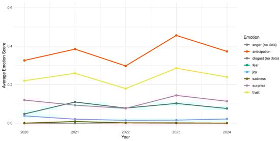 Temporal trends in average sentence-level emotion scores from 2020 to 2024, as inferred using the NRC Emotion Lexicon. Emotions were detected across textual data at the sentence level, capturing eight primary affective states: anger, anticipation, disgust, fear, joy, sadness, surprise, and trust.