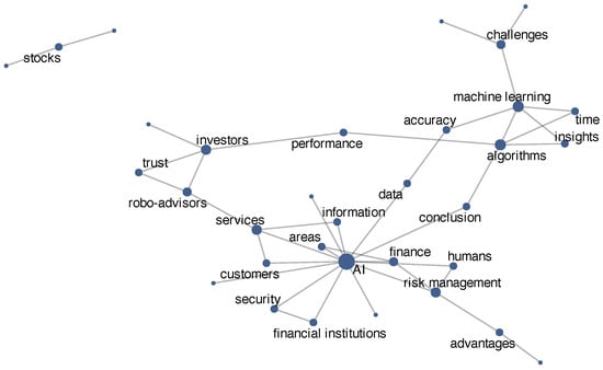 Graph exhibiting keyword co-occurrence. The phrase “Stocks” in this example occurs within a distinct silo of the literature and does not tend to co-occur across the corpus. “AI”, however, is well connected, and was found to be the most commonly used phrase co-occurring with other phrases.