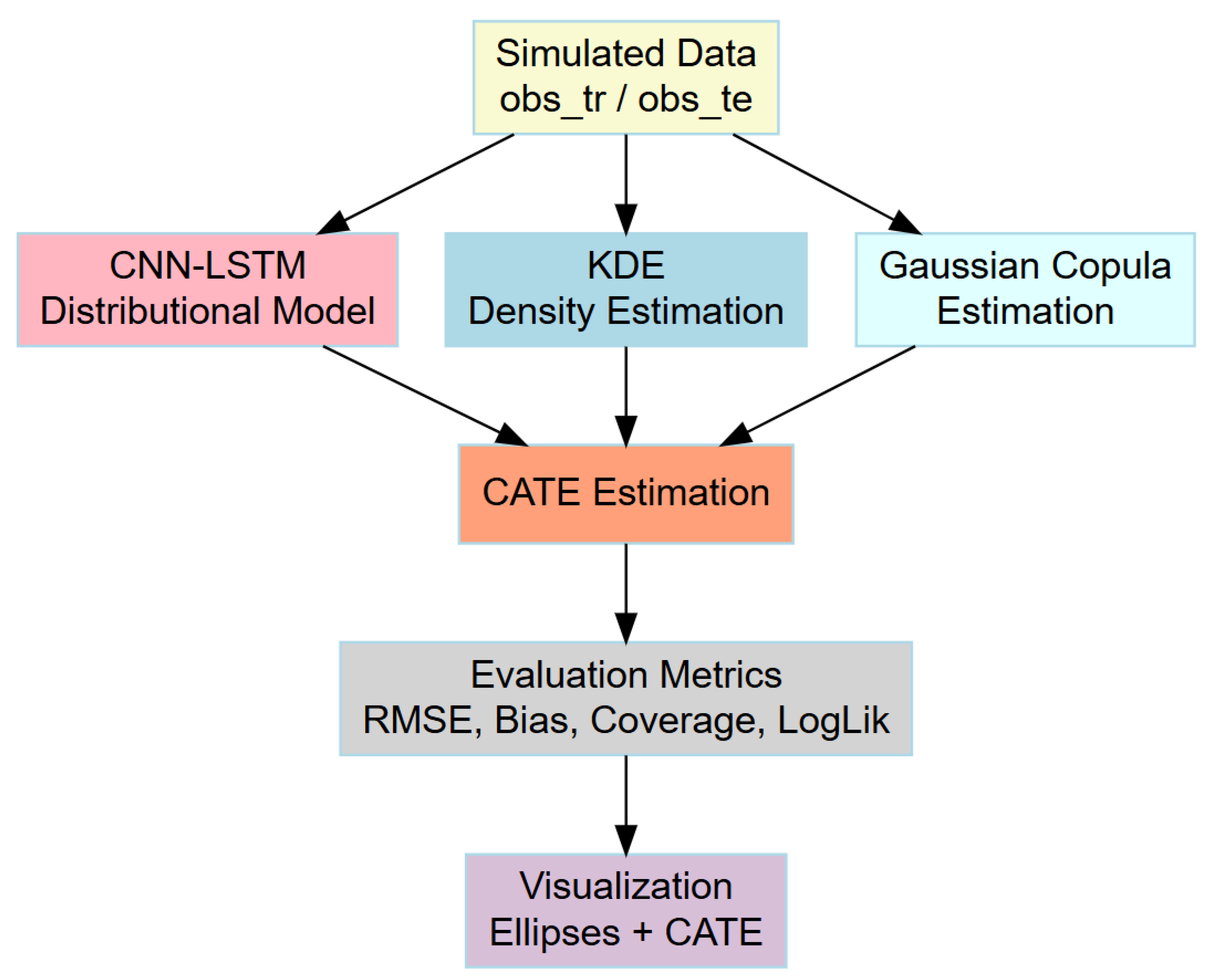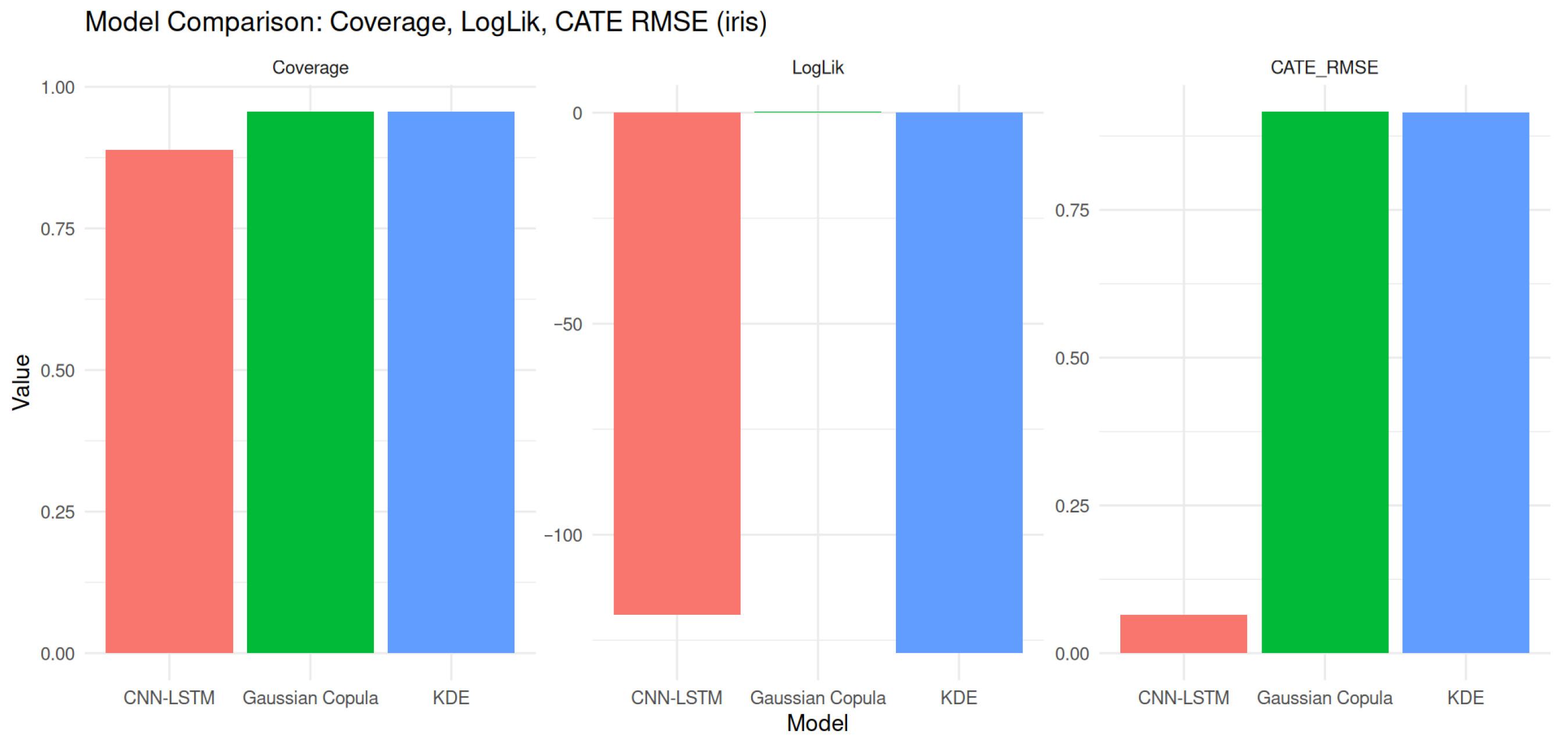 - CATE Bias: CNN-LSTM exhibits nearly zero bias (), while KDE slightly underestimates () and Copula slightly overestimates ().