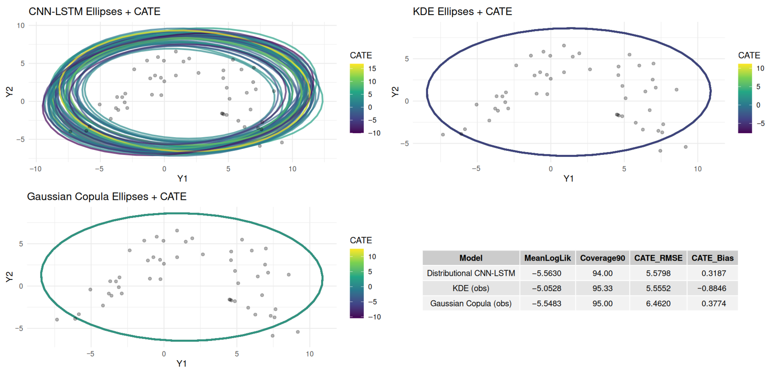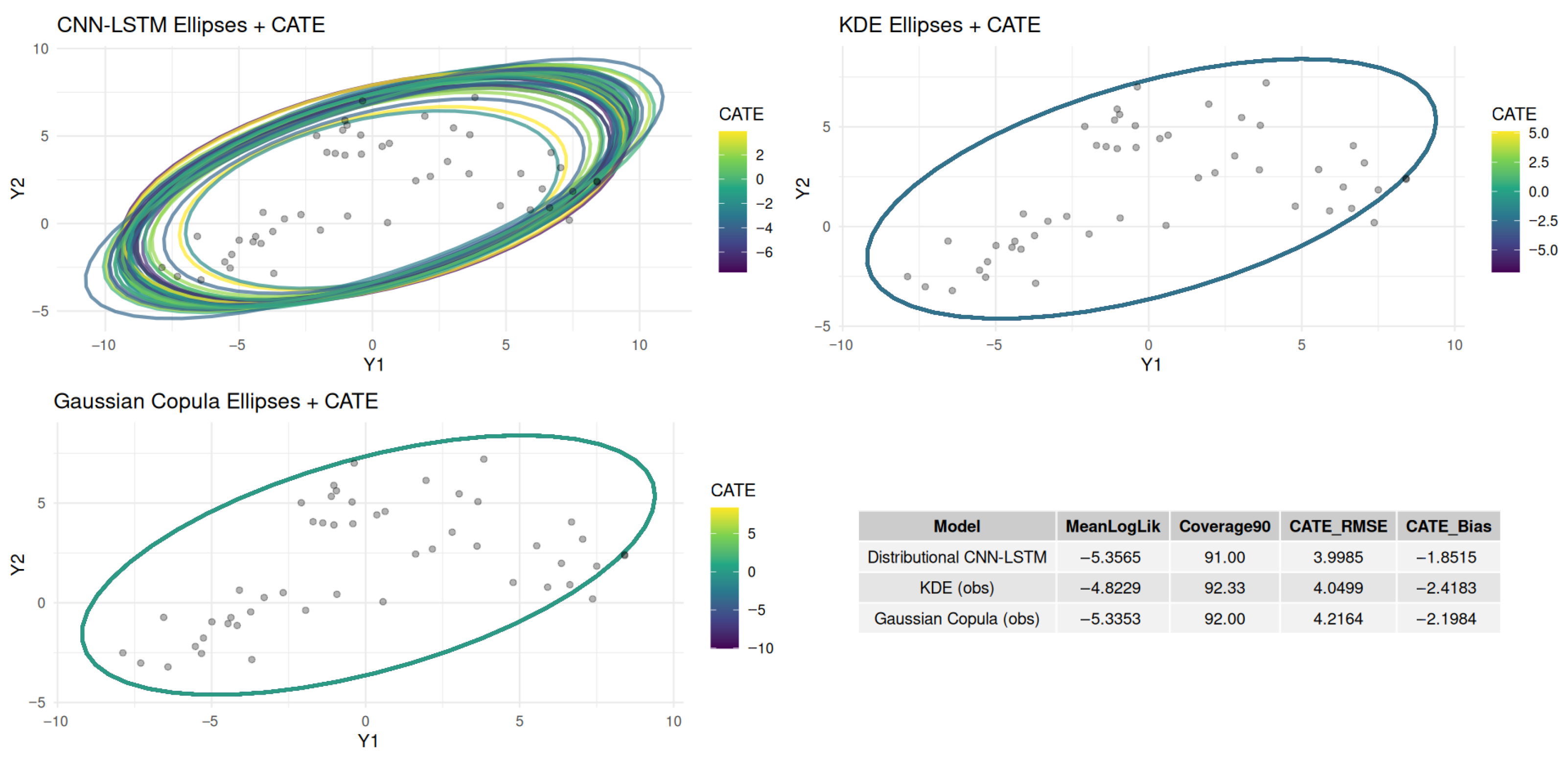 - CNN-LSTM: Displays multiple overlapping ellipses with varying sizes and orientations, capturing multimodality and asymmetric correlations. Ellipse colors correspond to , showing heterogeneous treatment effects across the distribution.