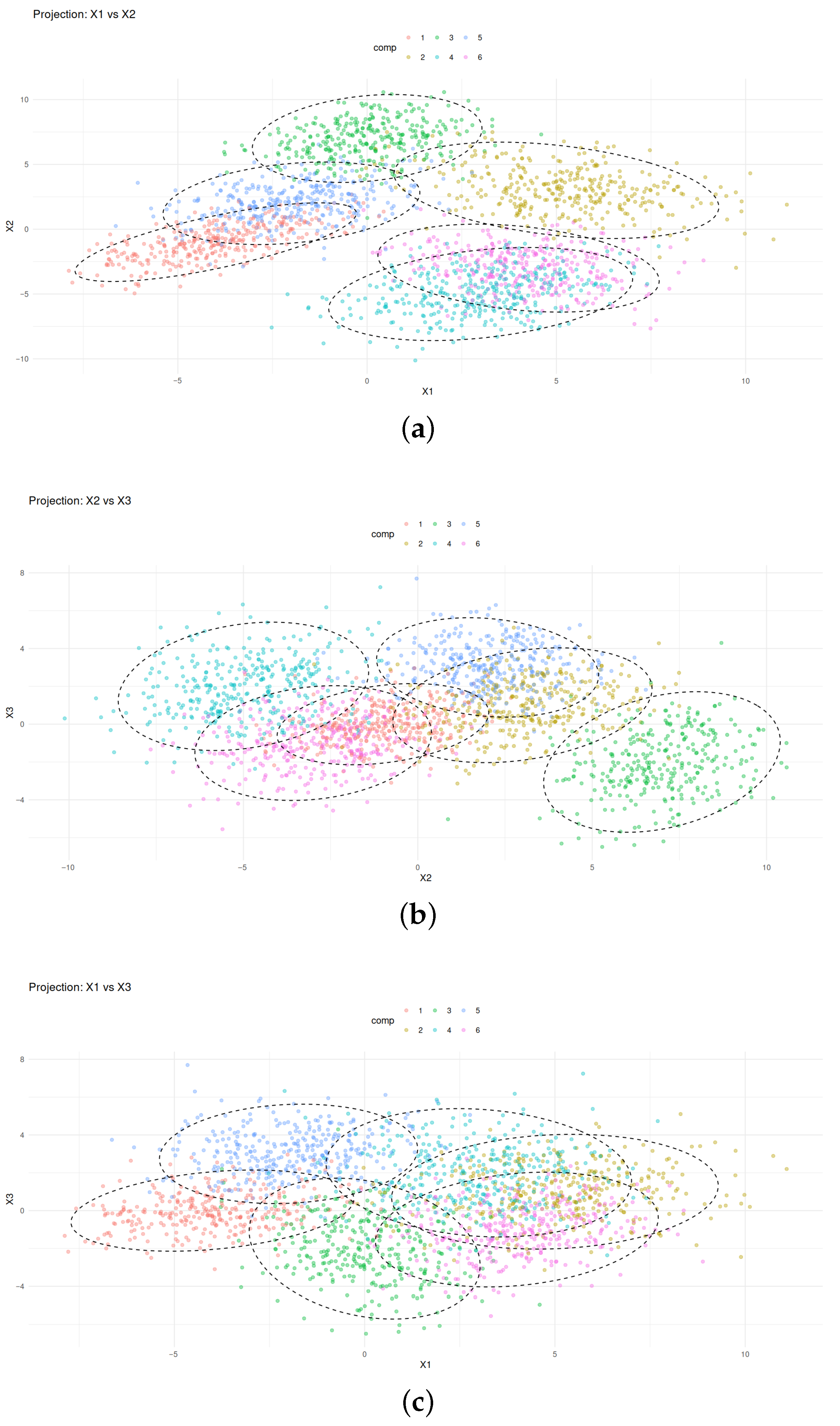 - K = 4–5: Overlapping ellipsoids reflect mixed correlations and high-dimensional complexity; CATE variation emerges both within and across clusters, showcasing the model’s ability to handle ambiguous component assignments.
