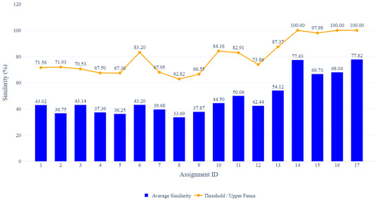 Traditionally, the upper fence in Tukey’s method is defined with the coefficient , which is generally effective for detecting outliers in normally distributed data. However, in the case of similarity scores between student codes, the distribution is often skewed and may contain multiple extreme values [32]. Using the conventional can either flag too many pairs (high false positives) or miss genuinely high similarities (false negatives).