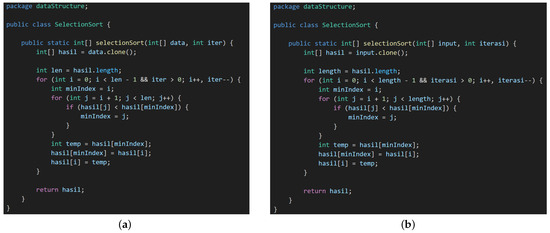 The following figures present selected case studies of student pairs with high similarity scores from the SelectionSort assignment. Figure 2a shows the execution results and code interface for Student ID 13, while Figure 2b shows the corresponding code for Student ID 4 with a similarity score of 84.87%. Both codes exhibit a pattern of potential plagiarism characterized by identifiers modification, where variable names from student ID 13 such as data is changed to → input, iter → iterasi, and len → length in the student ID 4 code while the overall code structure, logic, and algorithmic steps remain identical. This pattern highlights minimal efforts to disguise copied code while retaining functional equivalence.