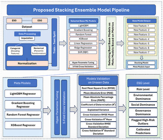 The methodological framework adopted in this study consists of systematic data preparation, pre-processing, feature transformation and model development procedures for ESG risk prediction. Each stage is designed to ensure reproducibility, minimize data bias and optimize predictive performance. Figure 2 demonstrates the methodological framework for the proposed stacking ensemble model pipeline used in this study.