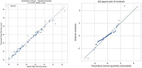 Investors, asset managers, risk officers and regulators may operationalize the predictive model to improve ESG screening, prioritize due diligence and make capital allocation or engagement decisions. The stacked ensemble, our leading predictor (RMSE = 1.006 and 1.3272; MAE = 0.664 and 1.1123; MAPE = 3.13% and 1.95%; = 0.979 and 0.854; explained variance = 0.979 and 0.854; for both datasets), has sufficient predictive error to rank firms reliably in portfolios and activate an investigator response. Analyses of diagnostics indicate residuals that are centered around zero with a small right skew, a few high-risk underpredictions and moderate heteroscedasticity; therefore, automated flags of high predicted scores should lead to personal review. The environment component (importance = 0.41), ESG risk level (importance = 0.37) and social component (importance = 0.32) are shown to be the most important drivers, with strong correlations (Environment–Total = 0.70 and Social–Total = 0.69). Possible multicollinearity, though, should be considered when explaining the effects of individual features. All in all, the combination of the human oversight of outliers and the model has the potential to dramatically improve screening throughput and consistency, improve early risk detection and facilitate evidence-based stewardship and regulatory reporting.
