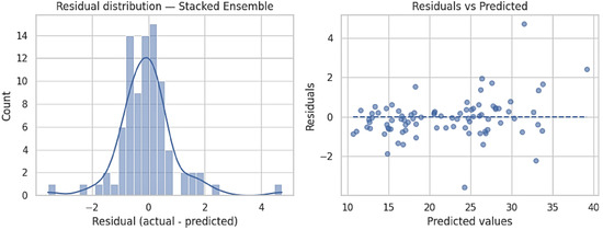 The distribution of the residuals (Figure 4) is narrowly centered around zero, which is expected given the high performance of the model ( = 0.979, RMSE = 1.006), and means that there is a minor systematic bias; the histogram/KDE reflects a single asymmetrically positive mode with a small number of extreme positive values, reflecting a slight violation against the normal distribution. The scatter plot of the residuals vs. predicted values (Figure 4) shows that there is no non-linear trend, which indicates that there is no significant model misspecification, and variance shows slight growth in some larger predicted values, with some outliers that indicate occasional underprediction. On the whole, the diagnostic analysis supports a well-calibrated tree ensemble that has low heteroscedasticity.